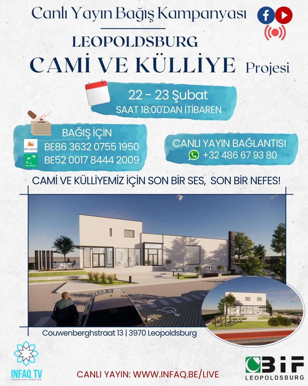 Toplumsal dayanışmanın en güzel örneklerinden biri olan Leopoldsburg Camii ve Külliye Projesi için hayırseverlerimizin desteğini bekliyoruz. 22-23 Şubat tarihlerinde INFAQ TV üzerinden canlı yayında düzenleyeceğimiz bağış kampanyasına sizleri de davet ediyoruz.